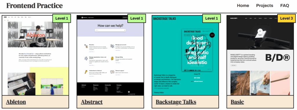 FrontendPractice.com es una colección cuidadosamente seleccionada de proyectos frontend realistas. Estos proyectos, que varían en dificultad, te permiten practicar tus habilidades en HTML, CSS y JavaScript mientras construyes interfaces de usuario funcionales y visualmente atractivas. La plataforma se centra en la práctica, que es esencial para solidificar los conocimientos teóricos y desarrollar un portafolio sólido.